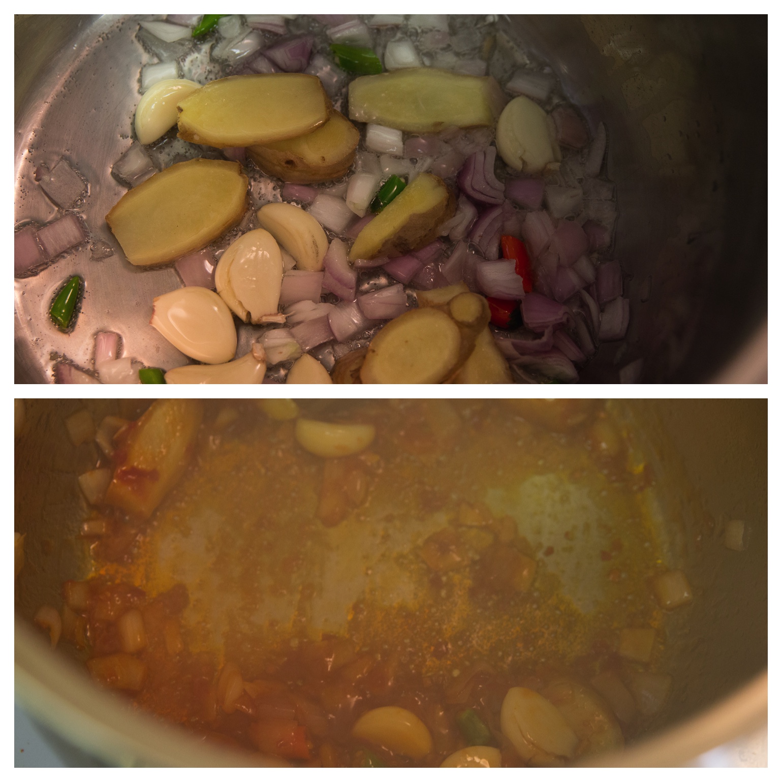 - Add the oil to the same pan and heat until shimmering. Add the sliced ginger, garlic cloves, shallot, and chilies. Cook, stirring, until fragrant, about 30 seconds. Add the chopped tomato and stir for another minute. Add the sugar and stir until dissolved, about 30 seconds. Add the chili bean sauce, and stir until the mixture just begins to bubble.