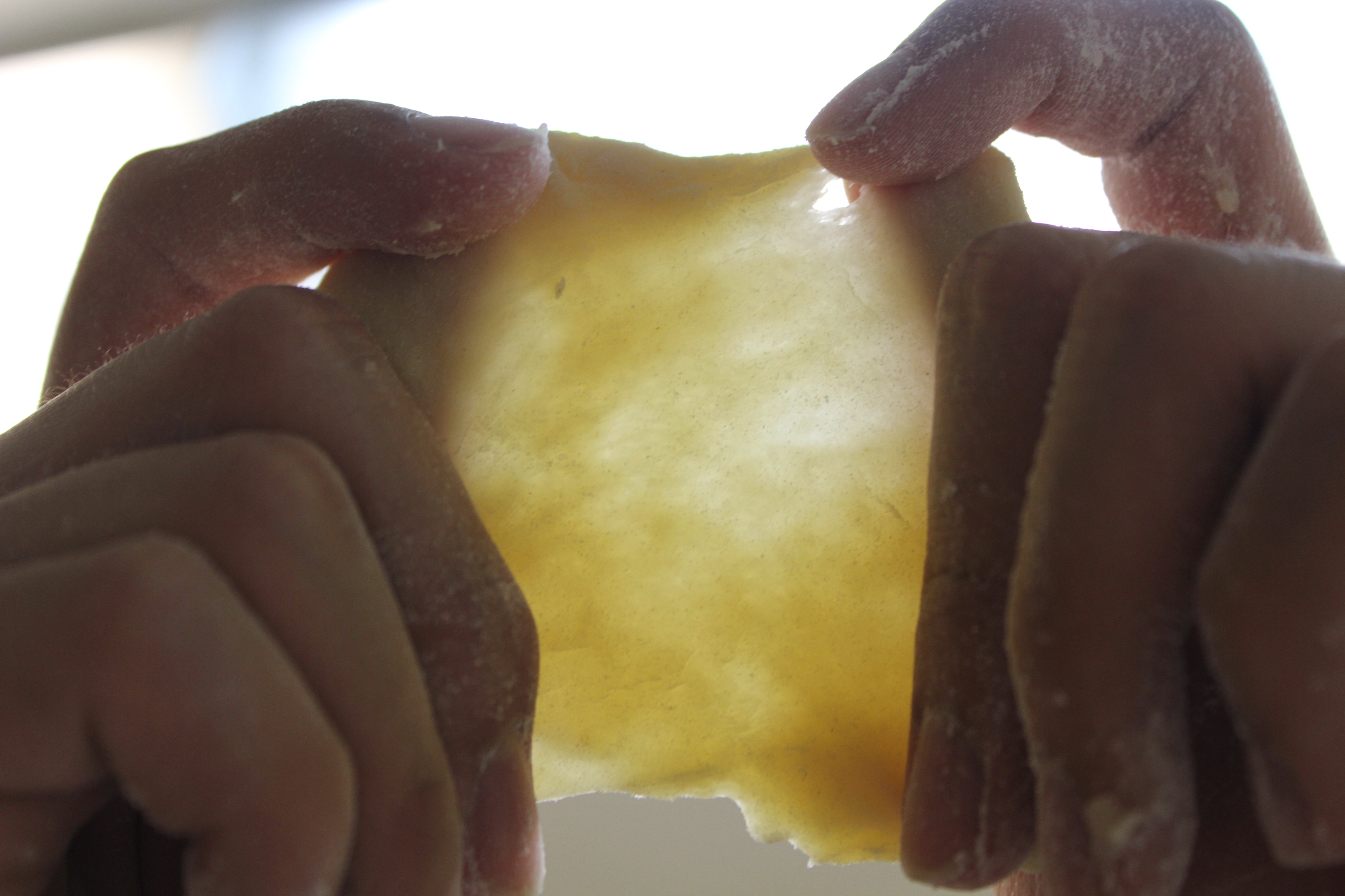One of the most common questions people have when they first start making bread is when to stop kneading. The best way is to dust your fingers with flour, pull a small piece off (the size of a marble) and try to stretch it as thin as possible. If the dough is fully kneaded, you should be able to hold up the stretched out dough and see the light shine through. You want something that looks like this: