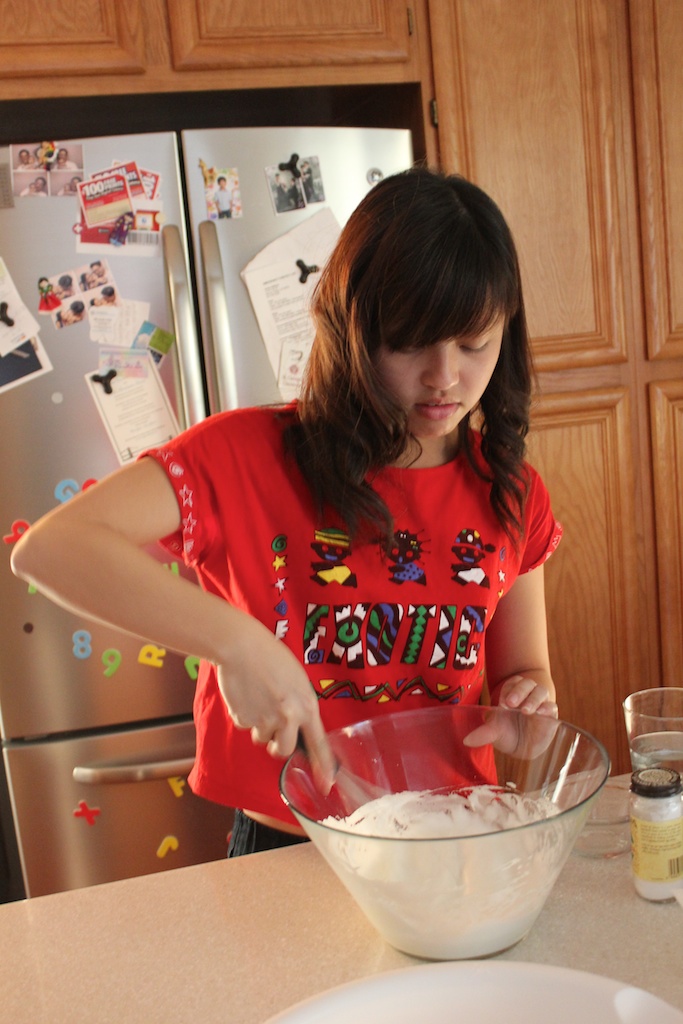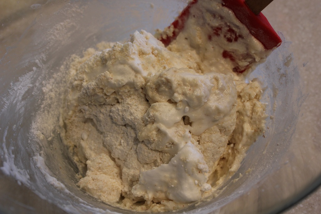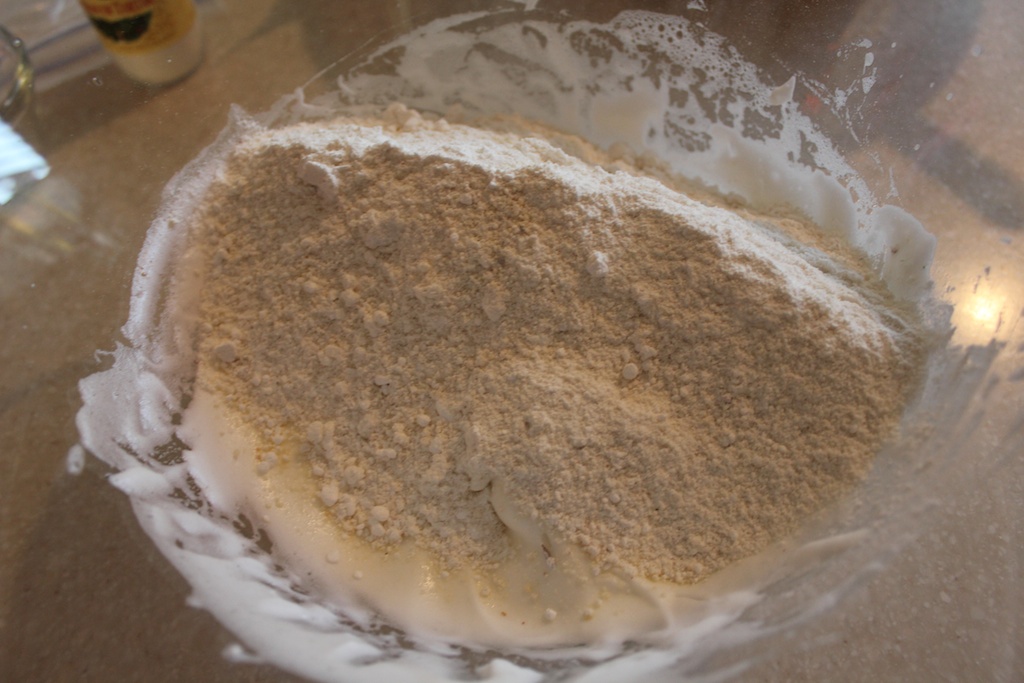 At this point, I added the sugar a little bit at a time. Because I was doing this by hand, I had Michelle help me sprinkle the sugar in as I beat the merengue. This was probably the worst part of the entire experience. By the time I had near-stiff peaks, my arms were exhausted. I ended up adding the dry ingredients in at this point instead of going for super stiff peaks. On a daily basis, go for a hand mixer or stand mixer if you have one and beat until you have stiff peaks!