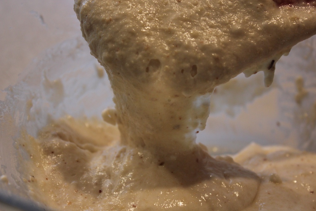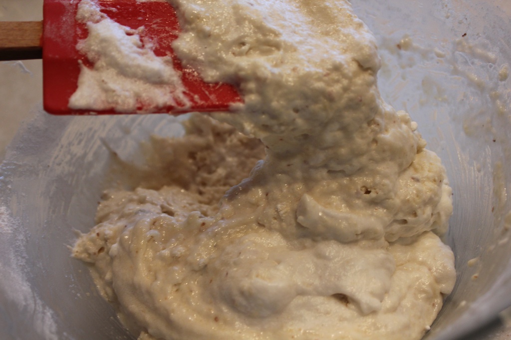 Here’s an example of what batter might look like after folding for a bit. Please note the thick and not smooth ribbon–this batter needs to be folded more.