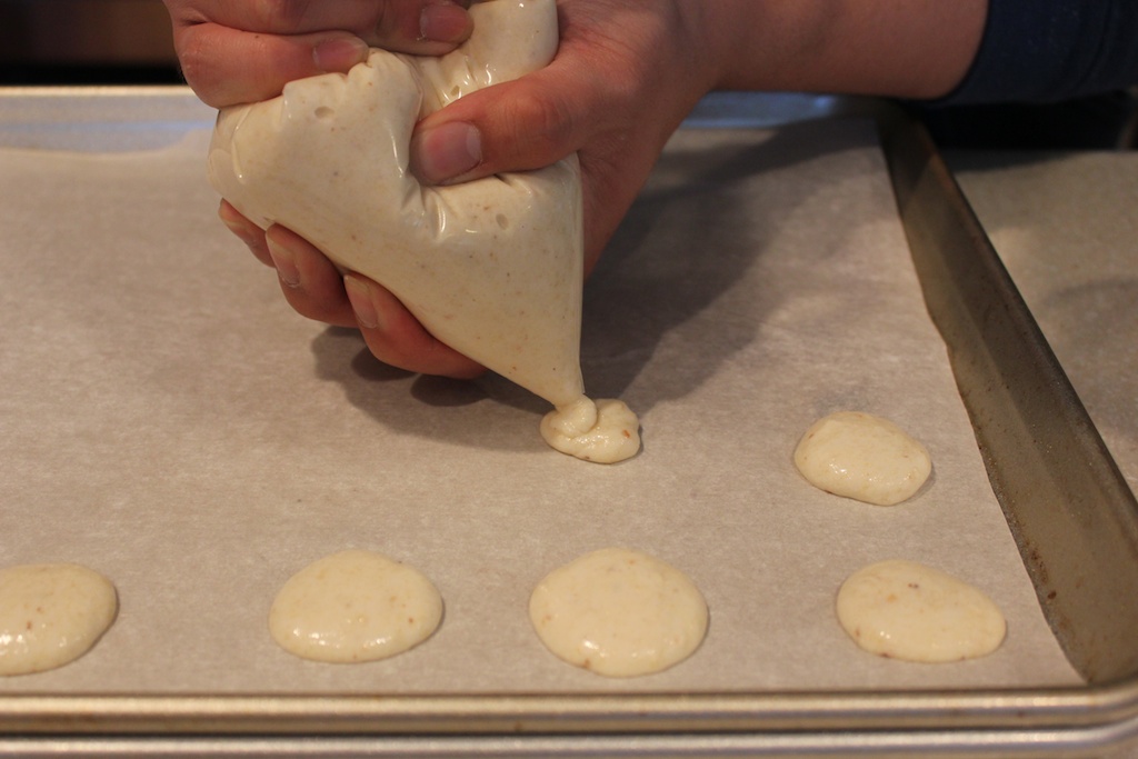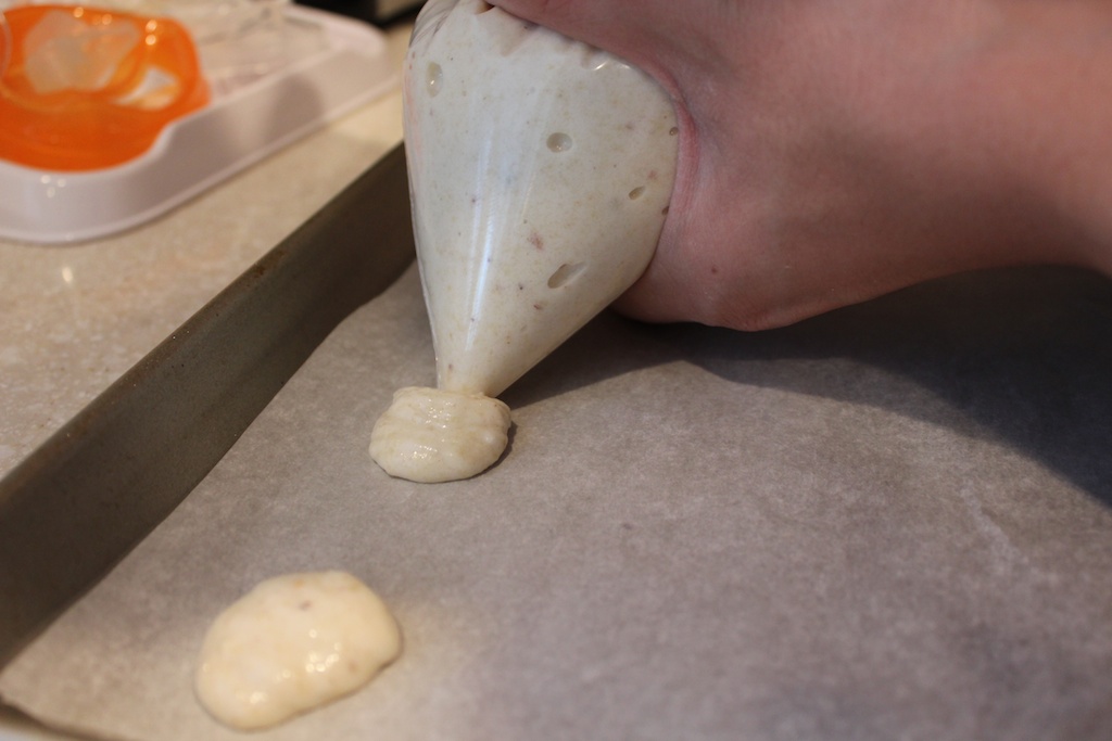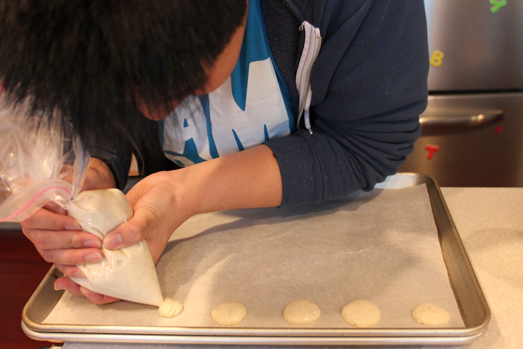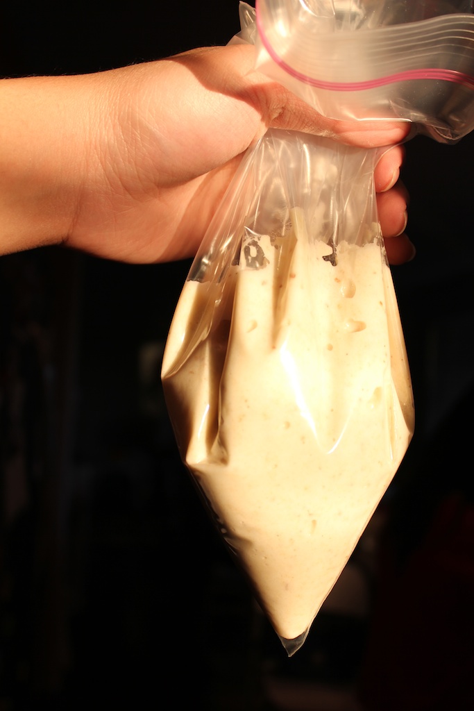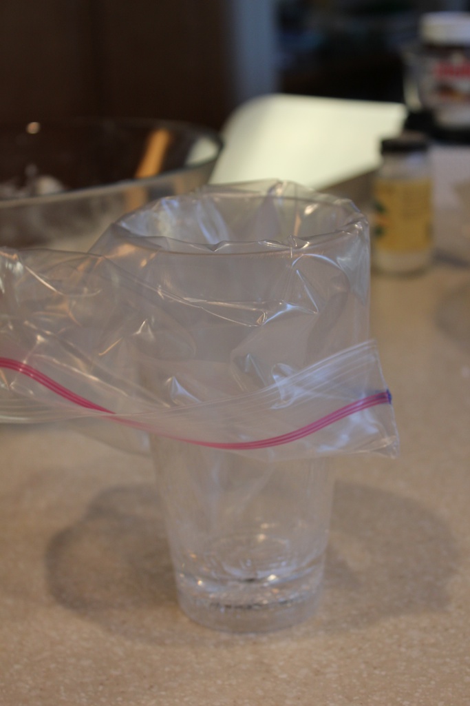 Next came time to pipe the batter. My trick to pouring batter into the pipping bacg is using a tall cup. I lay a gallon ziplock bag or pipping back and fold it over the edges of the cup. I then add all the batter into the cup; I usually end up pretty successful…