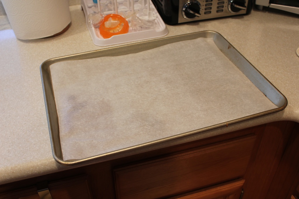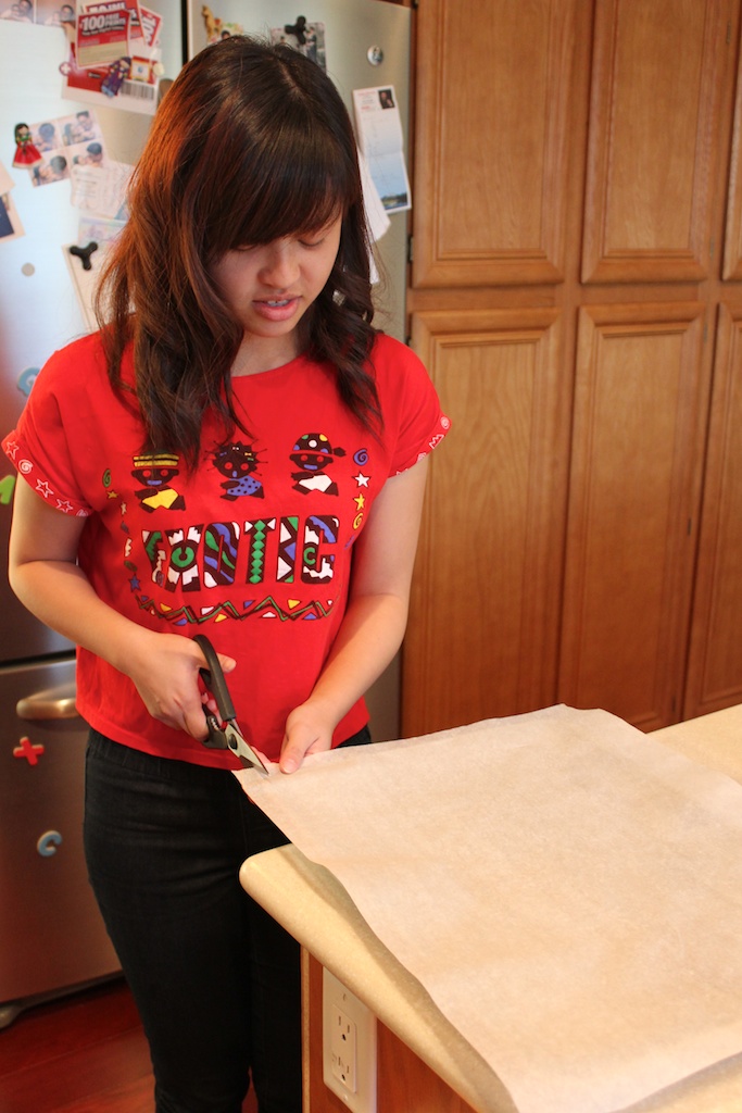 Next, Michelle lined some baking sheets with parchment paper and tailored it so my macarons wouldn’t come out all curved.