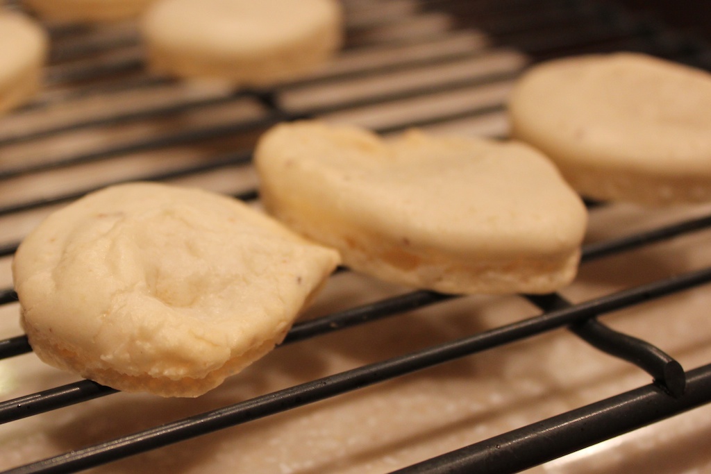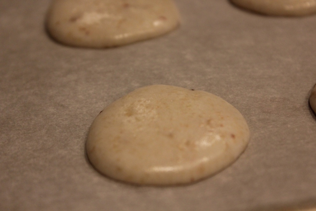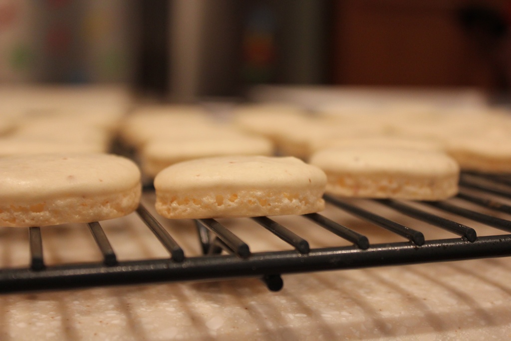 The macarons then sat in the oven for 16 minutes. You want to bake these for at least 15 minutes. To check for doneness, attempt to lift a macaron shell. If it lifts off easily without effort, your macarons are ready. If it slightly sticks to the parchment paper, make for two more minutes at a time. You want a slighly over baked, over crisp macaron (which will be fixed in a bit). Remember those macaroons with “chunks” during pipping? This is the result of not sifting out chunks: