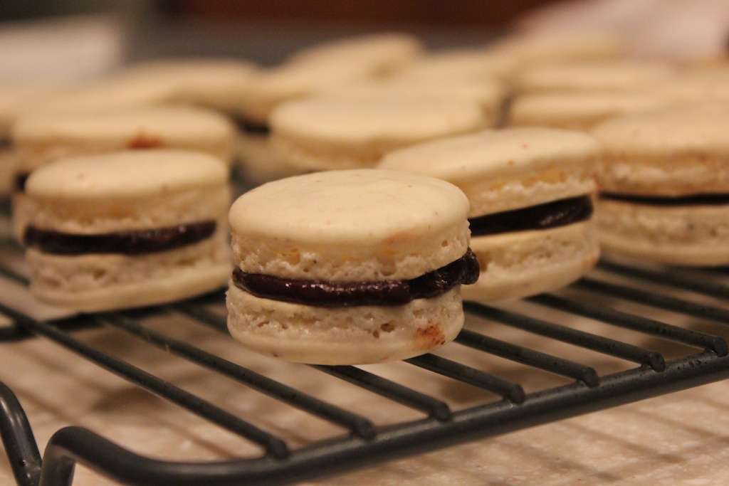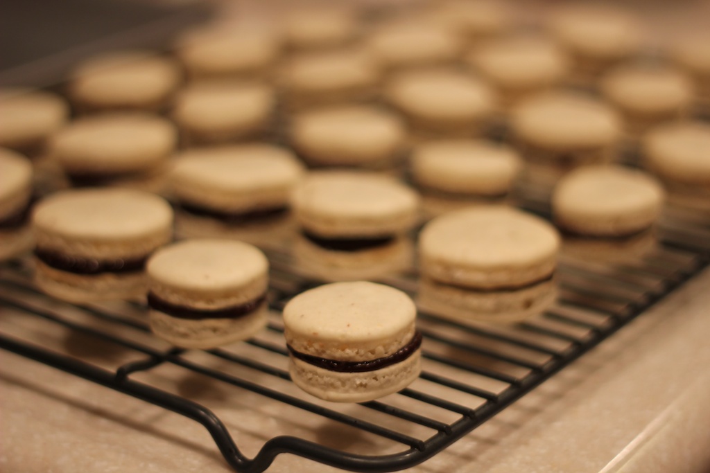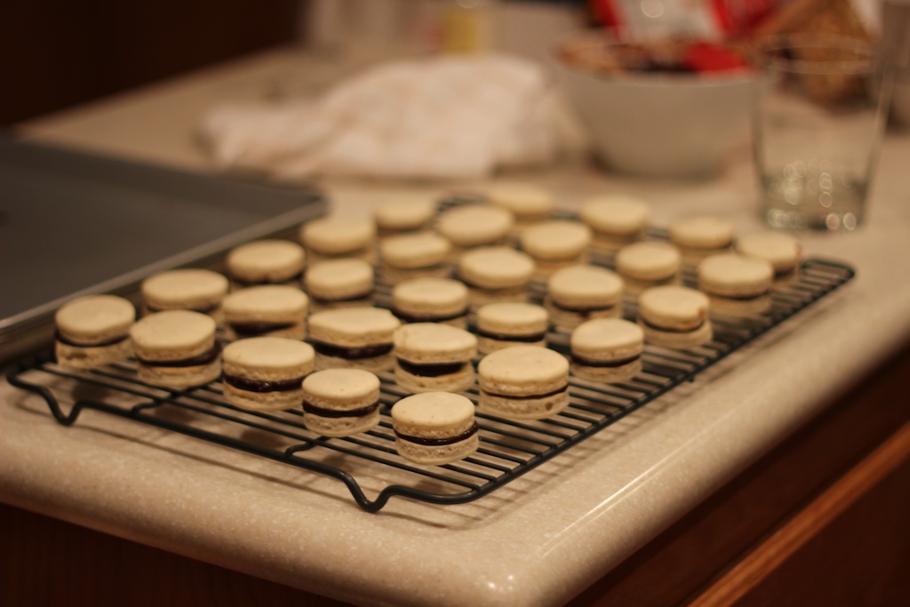 I pipped my ganache into the macarons and set it in the fridge to age. The idea is this: if you slightly overcook your macarons, you end up with the perfect macaron after it ages in the fridge for 24 hours. By aging the macaron, you allow the complex flavors to meld and develop. The moisture from the filling also helps reconstitute the famous chewy texture of the macaron.