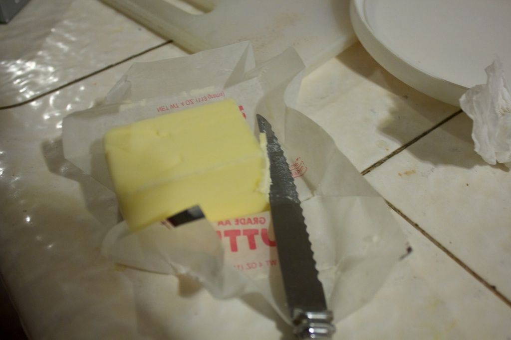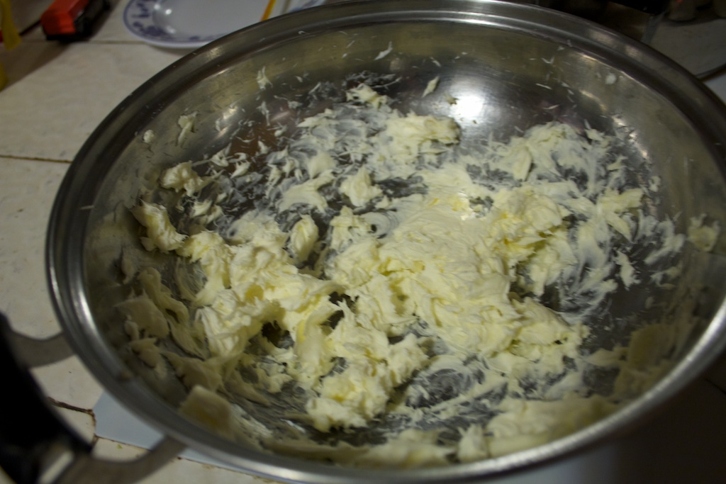 After the dough has doubled, I bake it in a preheated oven and start on the cream cheese frosting. I start by whipping the cream cheese and butter together. It felt really weird to not have my stand mixer do this.