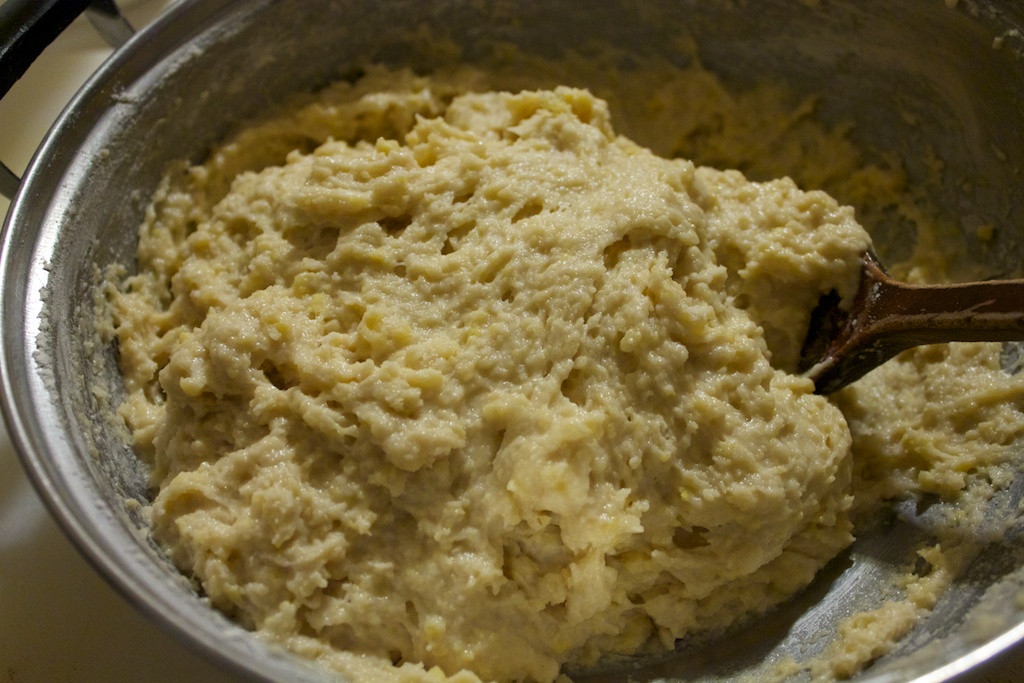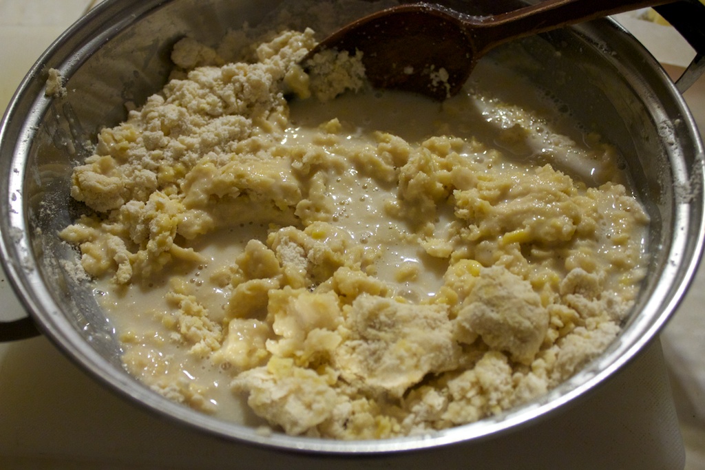 Then, I work my milk mixture into the dry ingredients. At first, it will seem chunky and unsmooth. This is fine; kneading will fix everything!