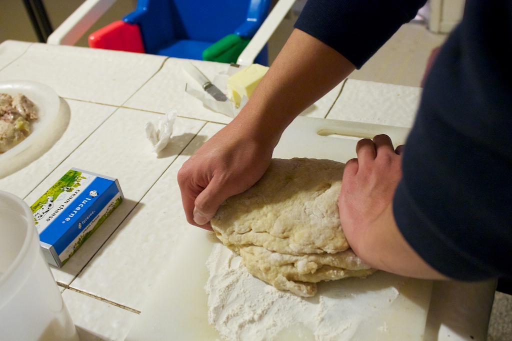 Cut the dough into 12 even pieces. I let Shun handle this as well, I have a tendency to mess up everything I cut when it comes to baking.