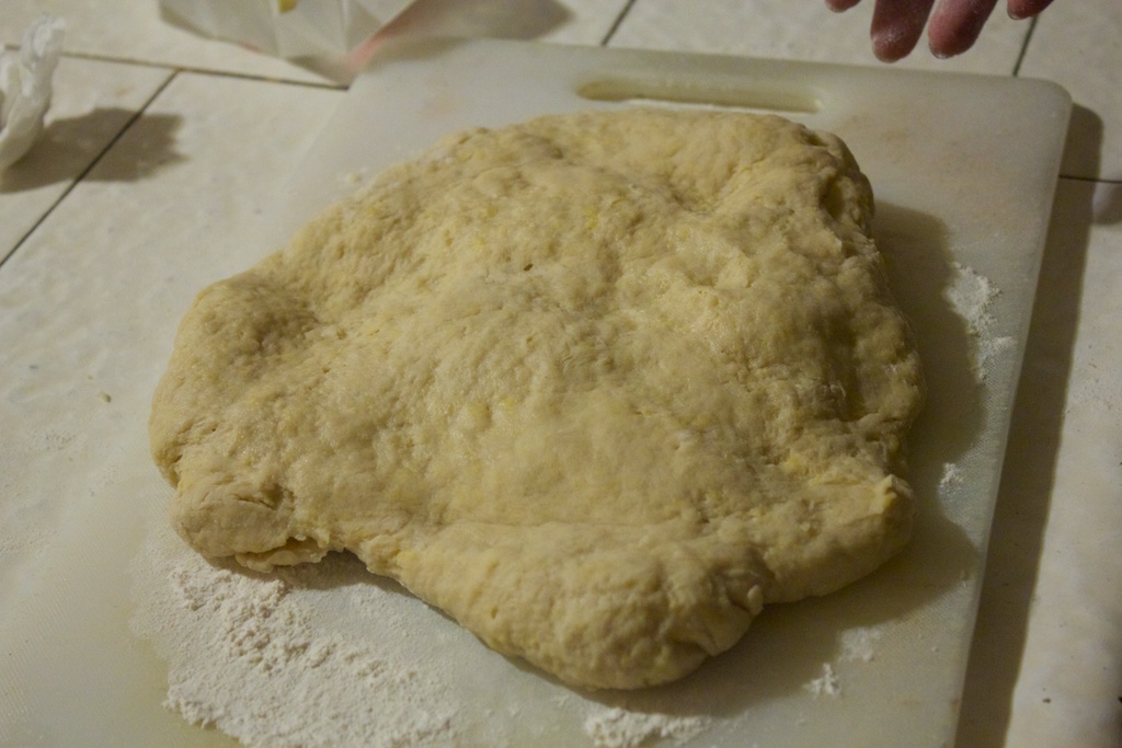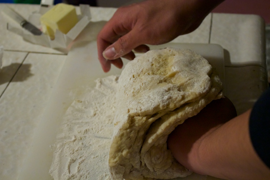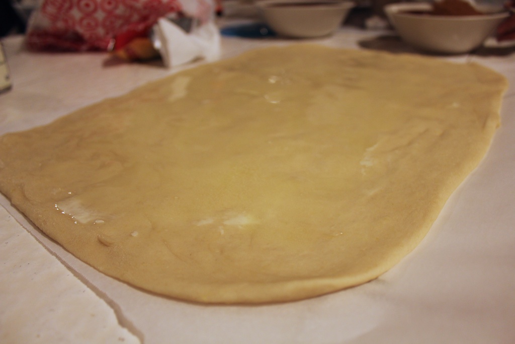 Then, using a rolling pin, knead your dough out and spread it with some melted butter… looks good enough to eat already…