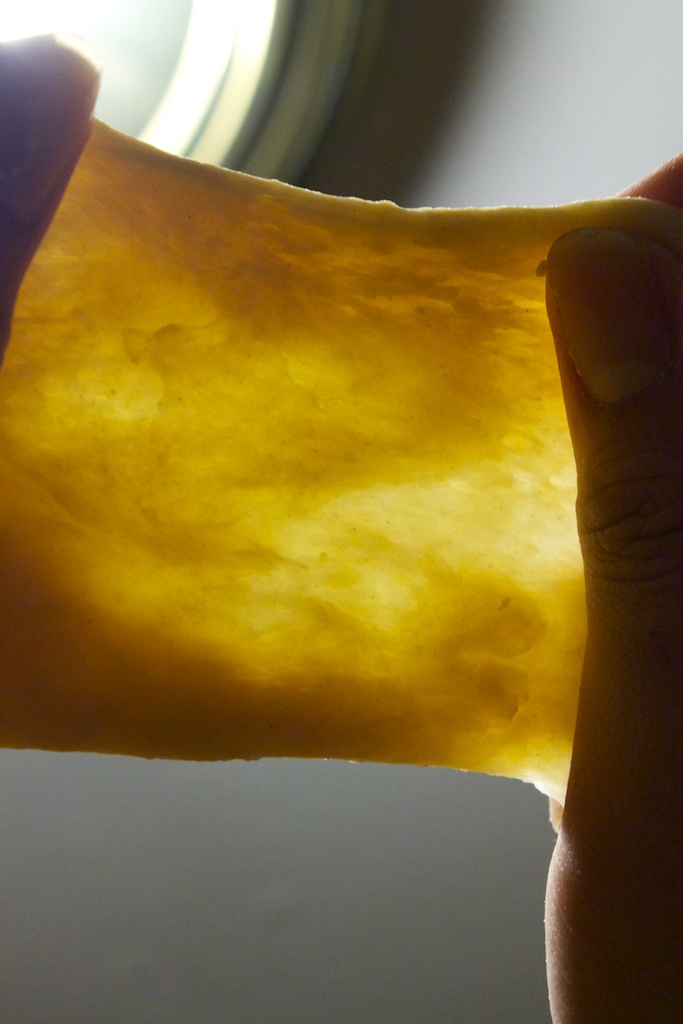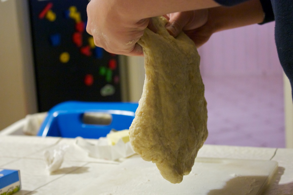 It’s a bit harder to get this dough to become entirely smooth, even with a stand mixer. So how do you tell when it’s kneaded? The window-pane test.