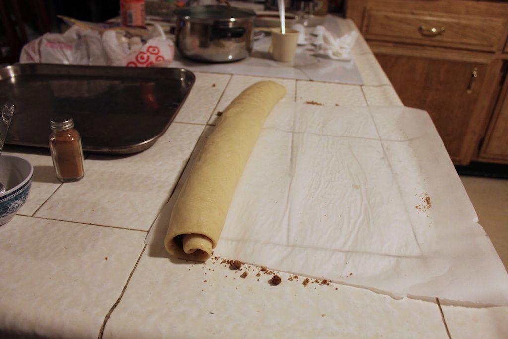 Dust the buttered dough with the sugar and spread it out thinly leaving a 1/4 inch boarder on top. Then, roll the entire dough up.