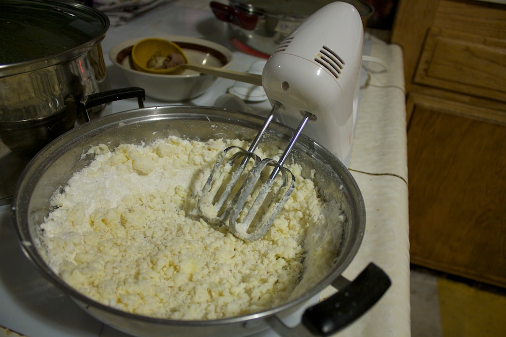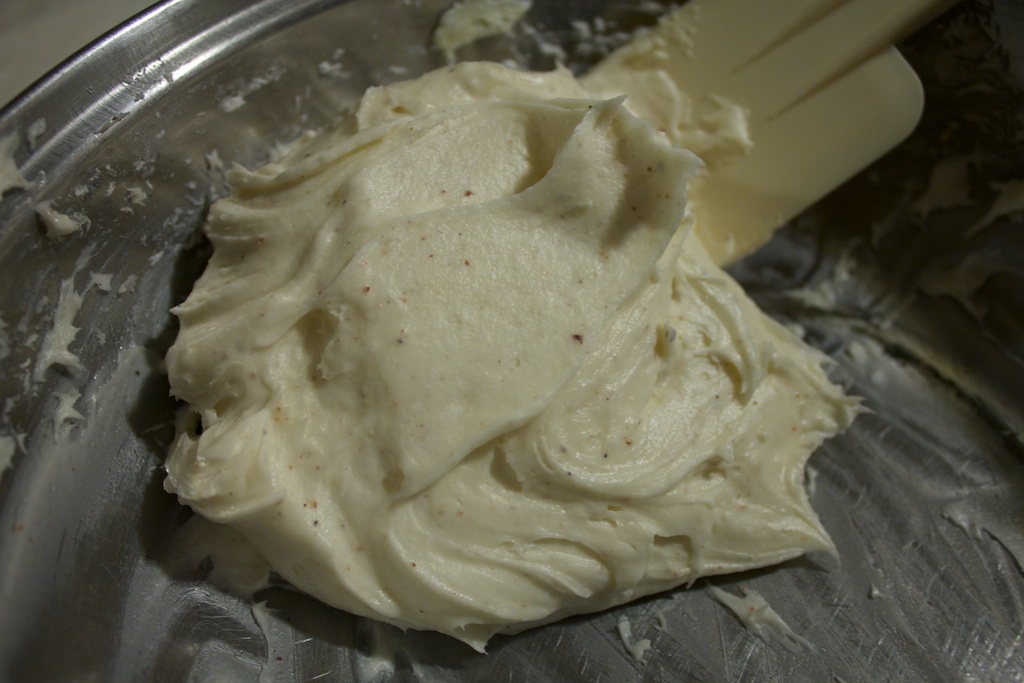After beating the cream cheese and butter until fluffy, I worked in powdered sugar and some nutmeg. The nutmeg was my personal special touch for the holidays.