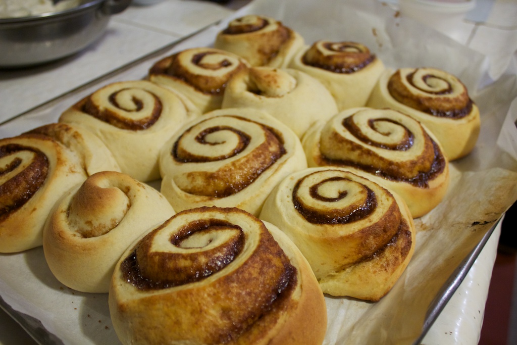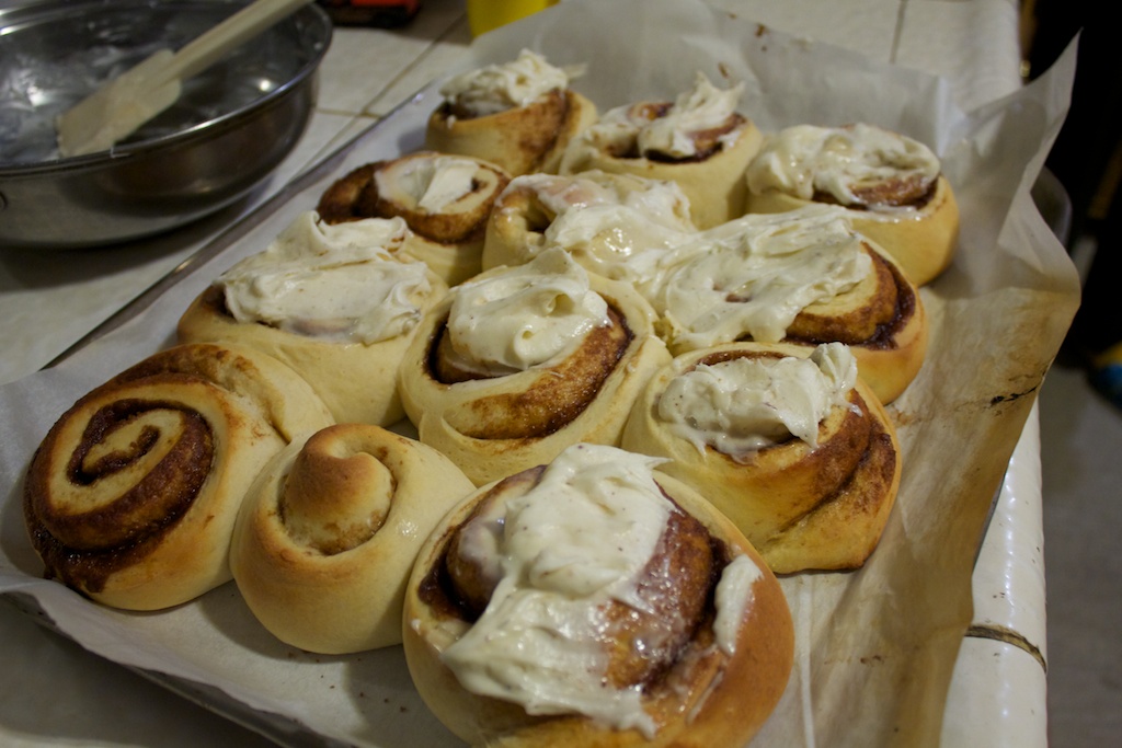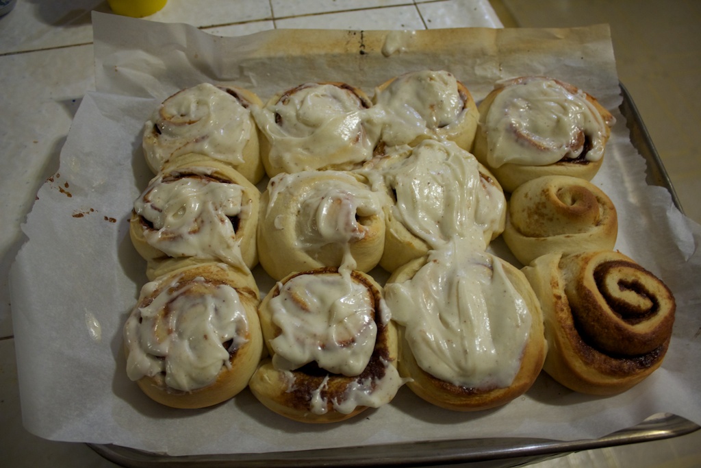 Success! The warm cinnamon rolls came out. I spread dollops of frosting on each cinnamon roll but I left two untouched for the baby.