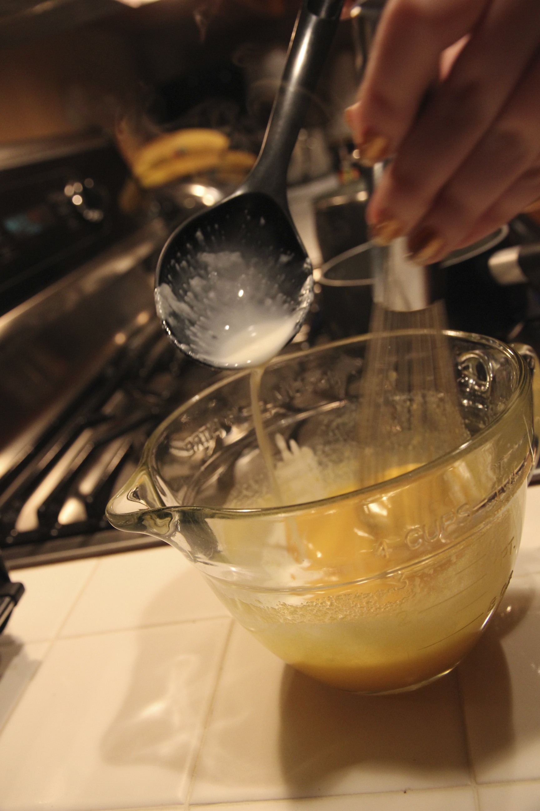 While whisking, slowly ladle the heavy cream in a steady stream. This step is known as “tempering”. By doing this, you are gently bringing the temperature of the egg yolks up instead of cooking the egg yolks and turning it into scrambled eggs. After you ladle about 1/4 of the cream in, pour the remaining cream into the bowl in a steady stream while whisking.