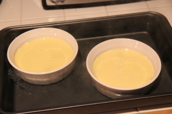 Preheat the oven to 375 F. Boil water in a medium saucepan, enough to fill a 9 by 13 baking pan half way. In another saucepan, heat the heavy cream on a medium fire.
