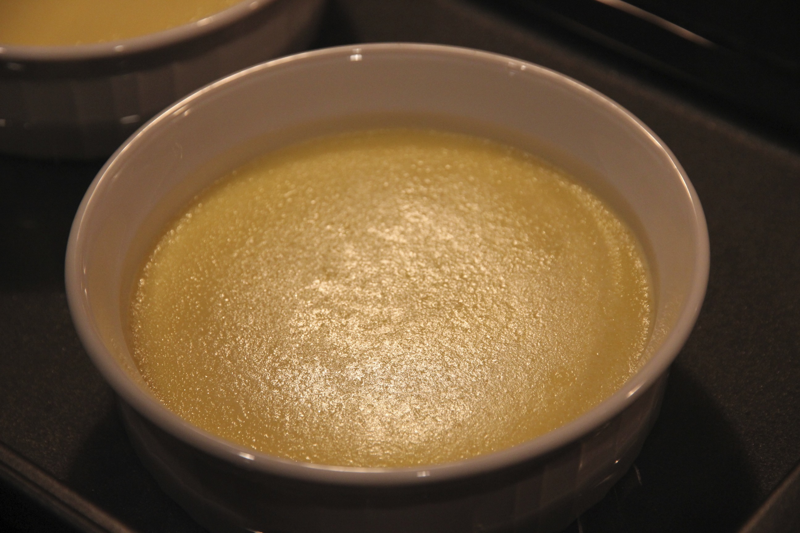 Using the ladle, skim the bubbles on top out.Place the ceramic dishes in a 9 by 13 baking dish. Fill the baking dish with the hot water until it reaches half way up the sides of the ceramic dishes. Fill the ceramic dishes with the cream mixture. Set the baking dish in the oven for 15 minutes. Gently shake the baking dish and if it is still thin, continue to bake for another 5 minutes. Repeat this process until the cream is set but still jiggles.