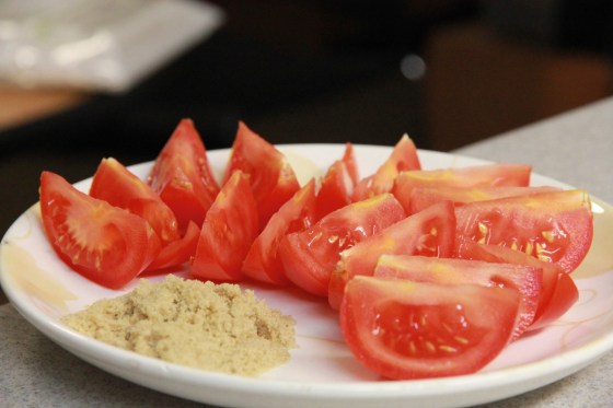 For dessert my friend served some yummy tomatoes and brown sugar.