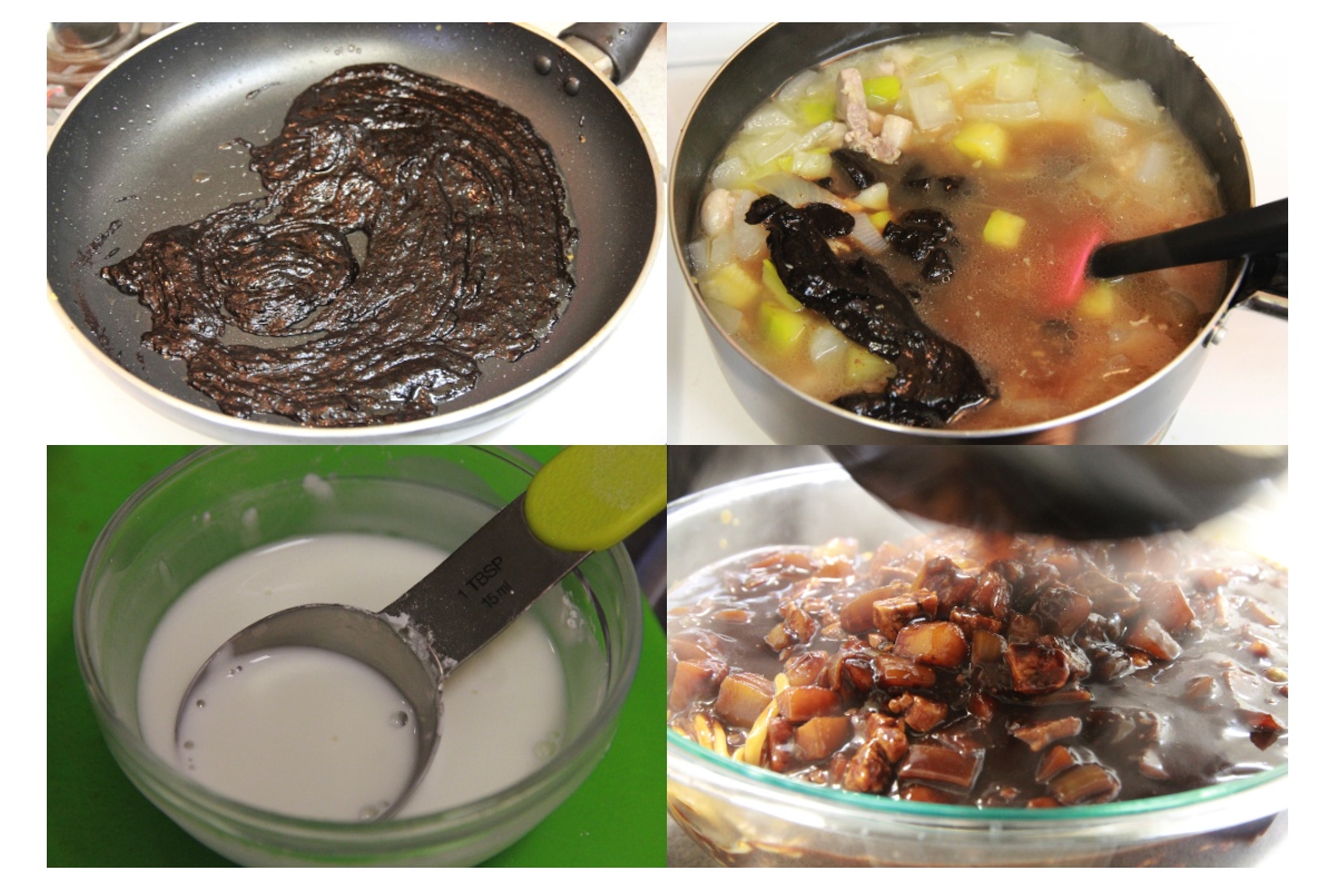 While the vegetables are boiling, heat a small skillet over medium heat with 2 Tbsp of vegetable oil. When it is hot, add the black bean paste and stir fry for a minute. When the vegetables and meat is ready, add the black bean paste and mix well.