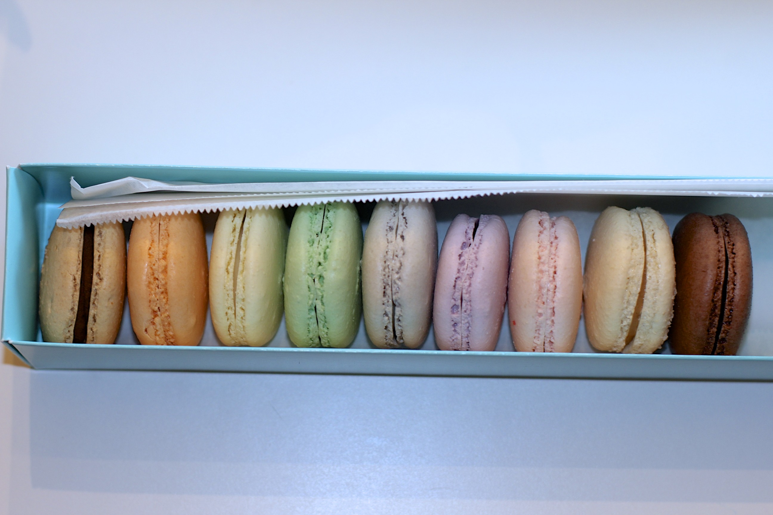The bakery itself was pretty. With a modern and simplistic entrance, the interior was decorated with a simple but modern perspective – but I wasn’t too focused on that at all. I had my eyes set on the macarons, the entire assortment of 11 flavors lined up on display. The macaron colors were soft like pastel, so soft that the lighter pink and yellow macarons were difficult to differentiate under the yellower light in my dining room.