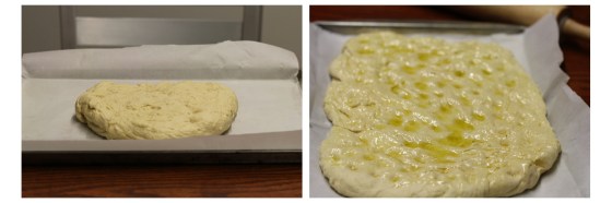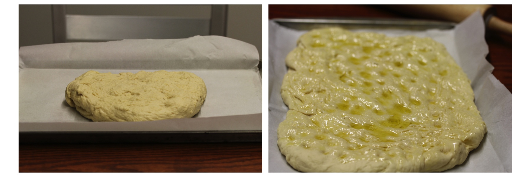- Spread or roll the dough into a rectangle, about 1/4 to 1/2 inch thick. using your fingers create dimples on the surface. brush with olive oil and sprinkle with sea salt as a finish.