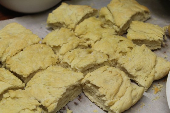 Water is slowly added to flour until the dough is able to completely absorb the flour and form a dense dough. After rising briefly, the dough is turned out, flattened and baked at a high temperature until golden brown and delicious. My friends all reminisced the similarities of this crumb and a biscuit’s.