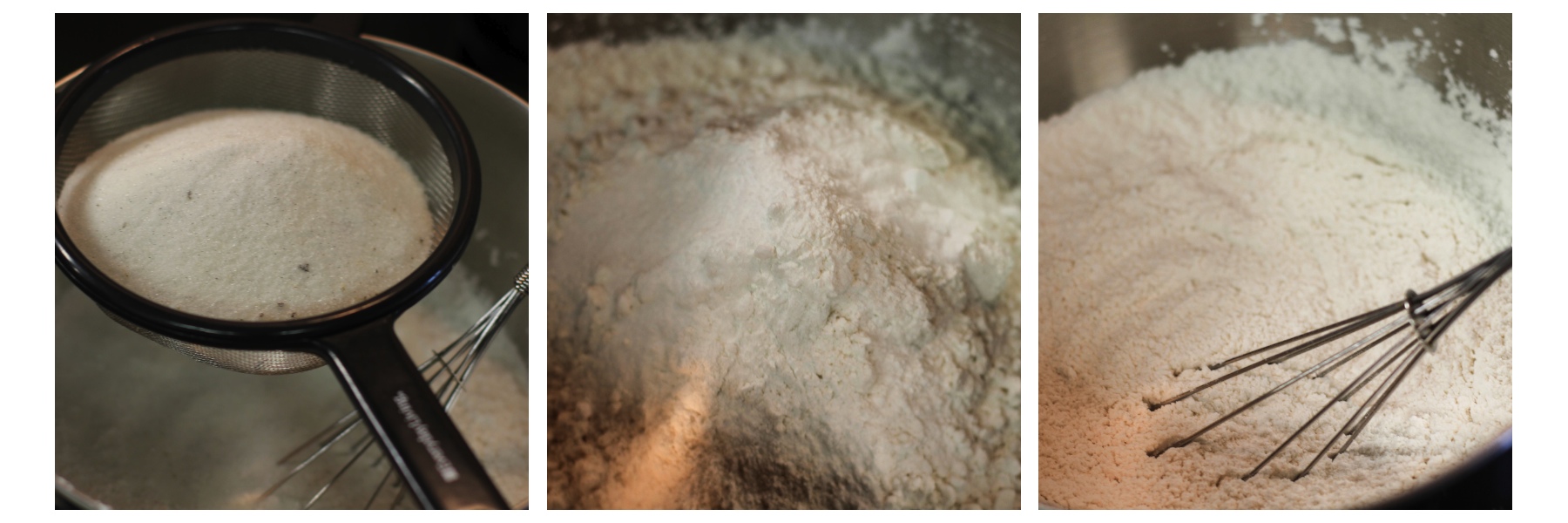 - Scrape the vanilla beans and combine with sugar applying pressure to break up any clumps of seeds and to better infuse the vanilla flavor into the sugar. Sift to help remove large clumps of vanilla and pod scrapings. Set aside.