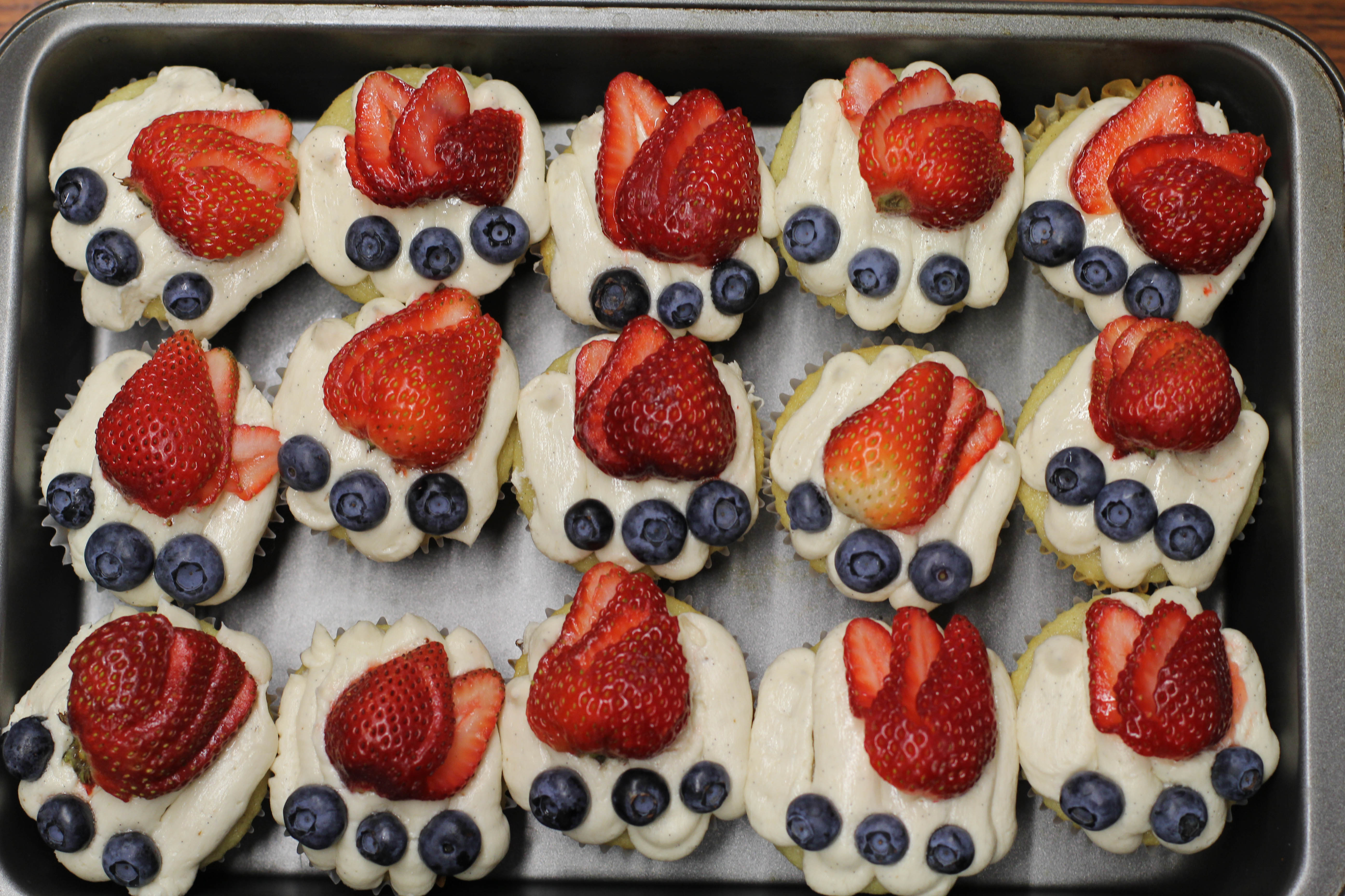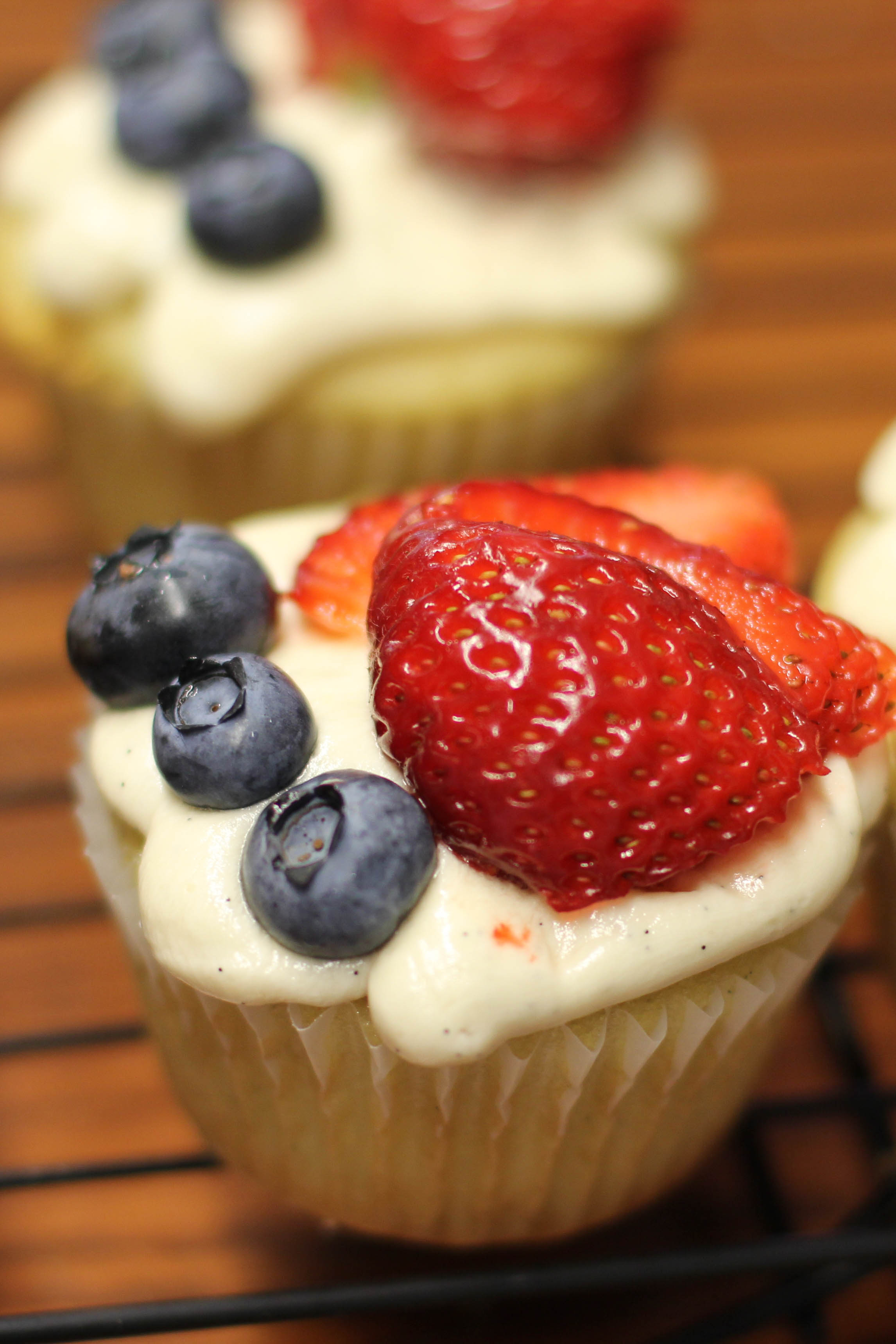 I highly suggest all of you to try this cupcake as soon as possible. Even if that means skipping down to the recipe right now. If you want to try and make your cupcakes look like the ones i had in the pictures, pipe the vanilla frosting Fan out sliced strawberries and decorate with blueberries.