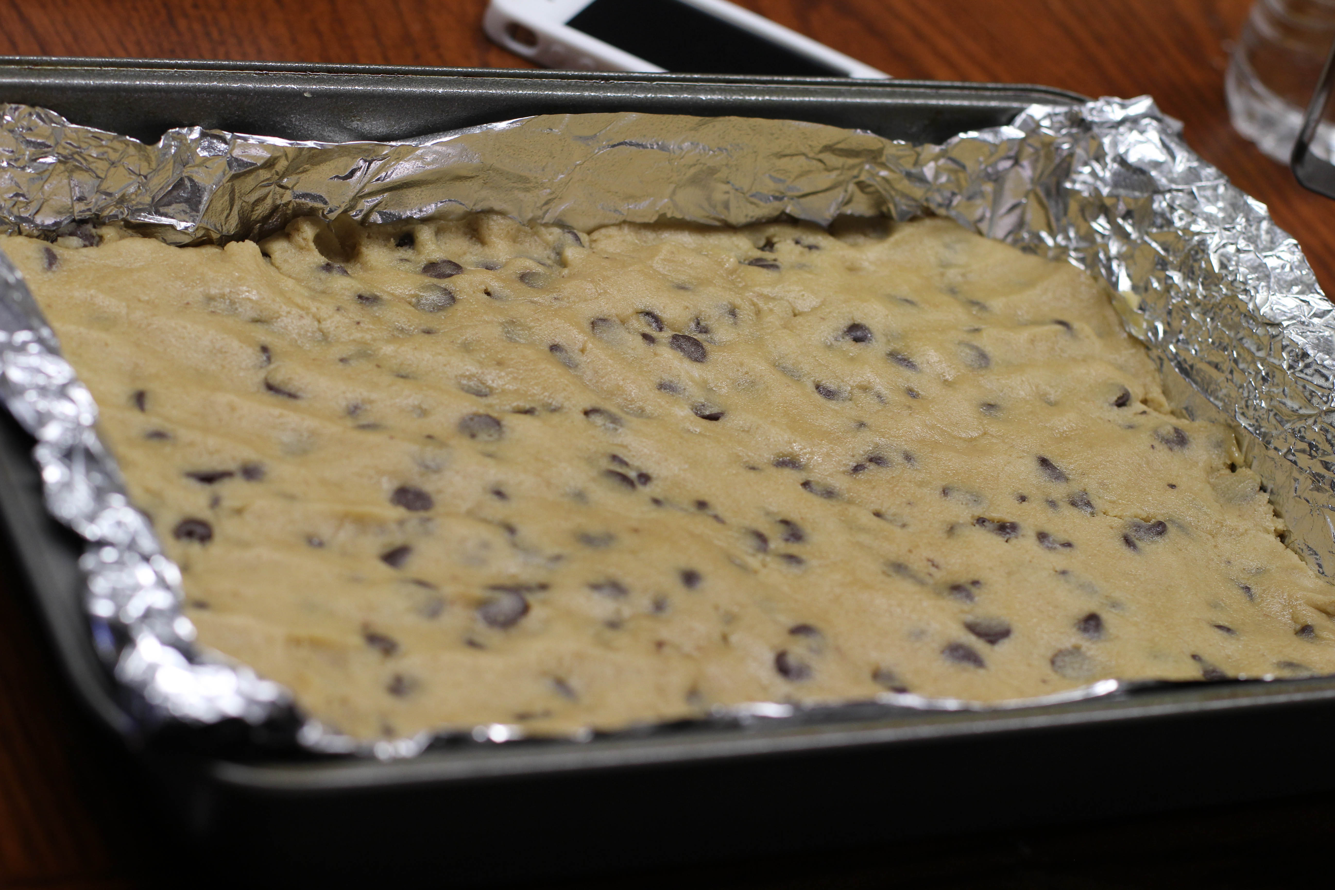 1. Preheat oven to 325 degrees F. Line an 8×8-inch baking pan with aluminum foil. Spray with Pam for Baking, or spray with pam and dust with flour.