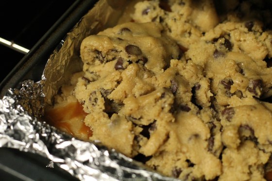 3. Spread half of the dough out in the bottom of the baking pan. Spread the caramel sauce over the cookie dough and drop the remaining dough in clumps over the caramel – the dough will bake together, so don’t worry if the dough doesn’t cover the entire pan.