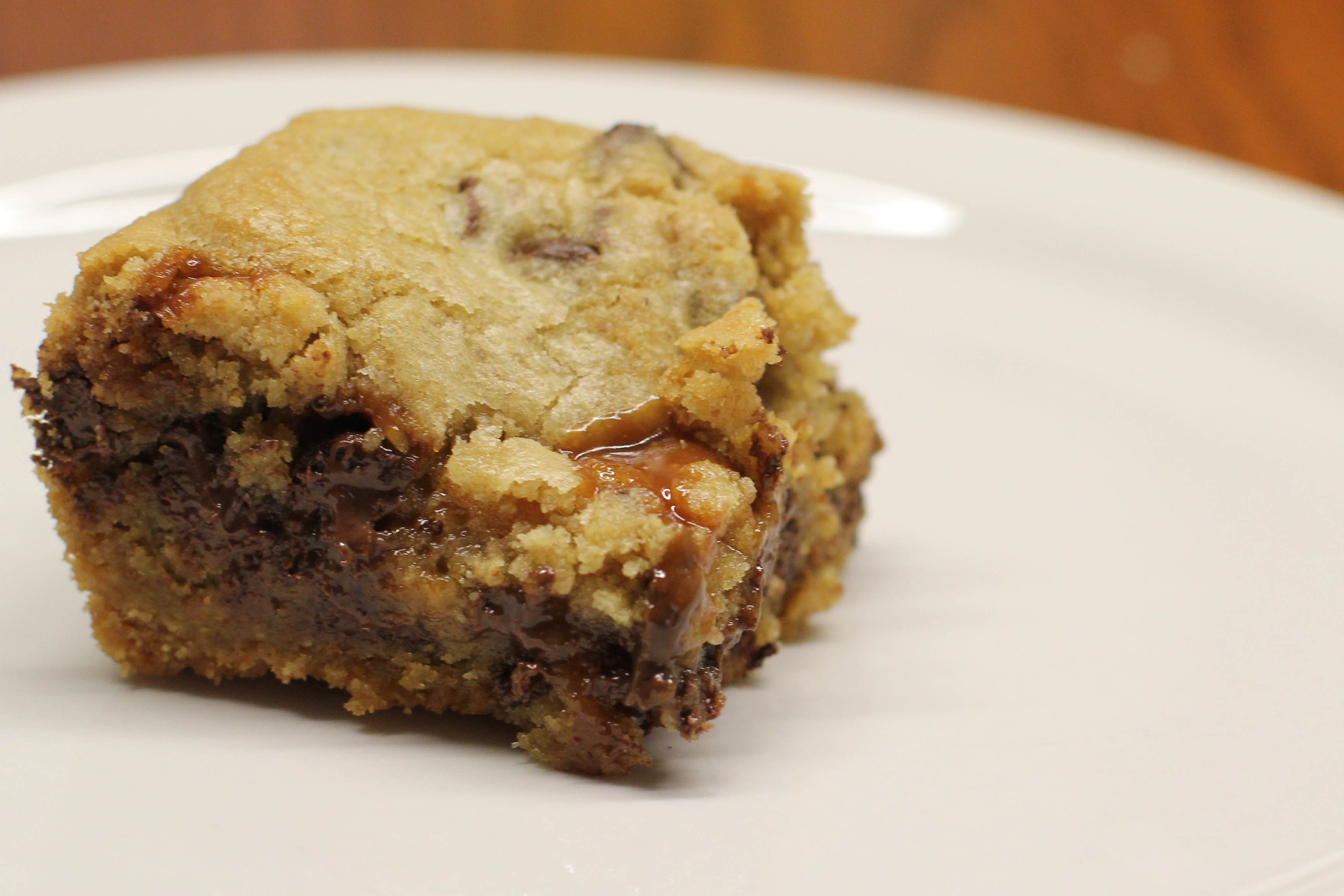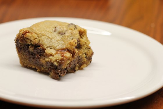 When I made the recipe, I doubled everything and baked it in an 13 by 9 baking pan. I was kind of afraid that the cookies wouldn’t cook all the way through. They didn’t. That didn’t compromise the blondies though! The blondies, like my chocolate chip cookies need some time to set when they first come out of the oven. If you like your cookies cooked all te way through, I’d recommend not doubling the recipe and baking it in a 8 by 8 square pan.